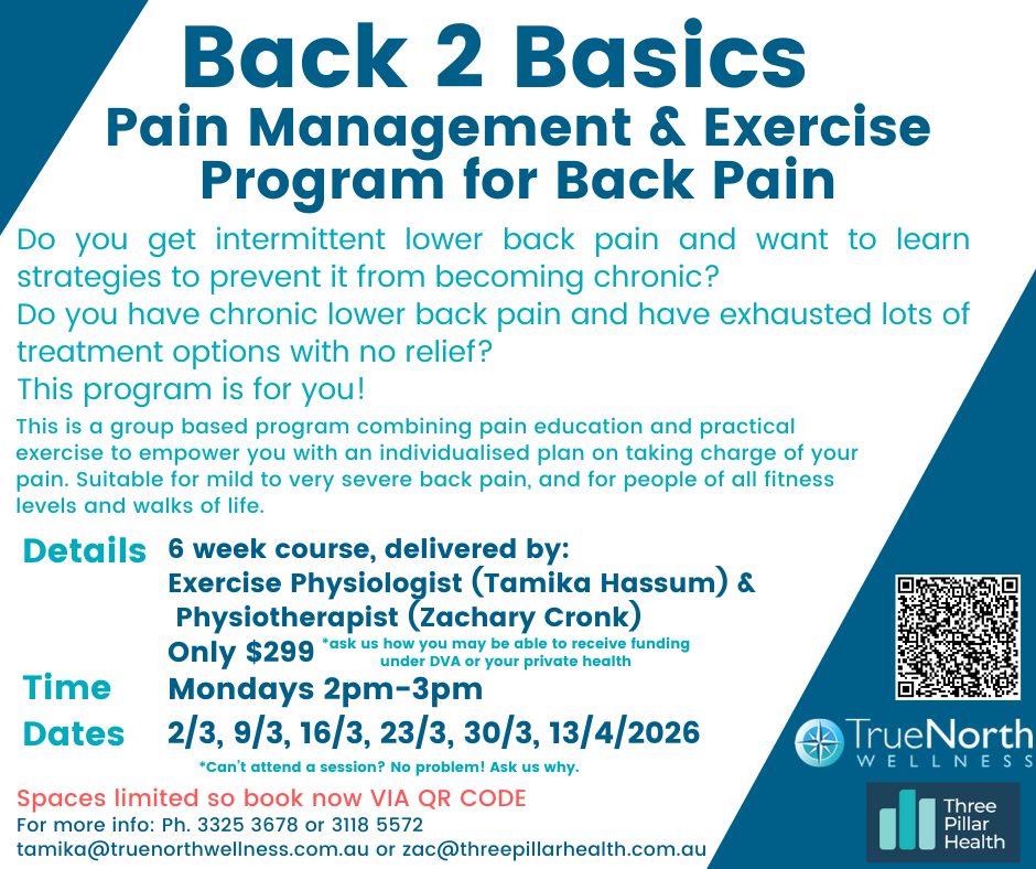 Details: 6-week course, delivered by: Tamika Hassum (Accredited Exercise Physiologist at True North Wellness) and Zachary Cronk (Physiotherapist at Three Pillar Health).